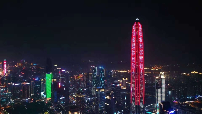 深圳市地标建筑上的致敬标语。(图片来自《羊城晚报》)