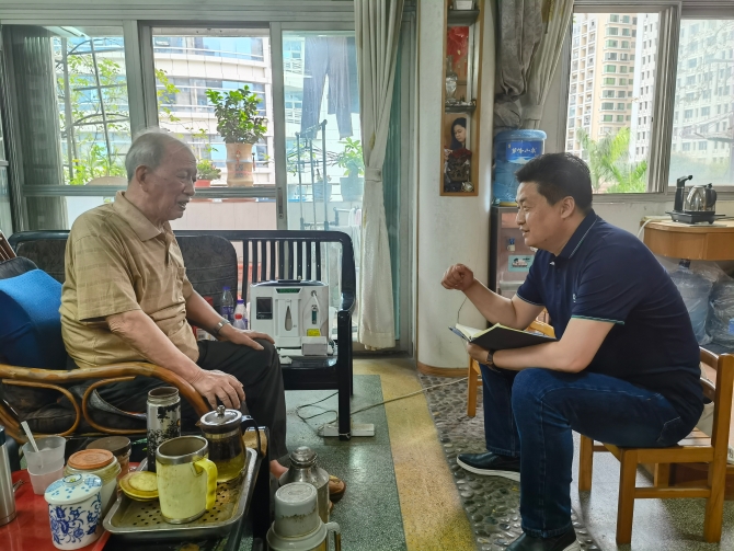 本刊记者孙进军(右一)正在东深供水工程建设者家中采访。(张嘉雯 摄)