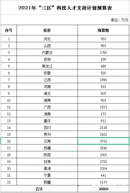 昆明信息港讯 记者黄彩英 据财政部网站5月10日消息,财政部近日向22个省(自治区、直辖市)下达边远贫困地区、边疆民族地区和革命老区(以下简称“三区”)科技人才支持计划预算,合计3.09亿元,用于组织开展科技工作者选派和培养工作,云南省获3733万元经费支持。