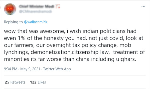 有的评论敬佩米克·华莱士的坦诚,认为“如果印度的政客如果有您的百分之一诚实就好了,不止是新冠,看看我们的农民,我们朝令夕改的税收政策,暴民私刑,废除纸币,公民法,少数民族的境遇,这些都比中国糟多了”。这条评论获得了最多的点赞。