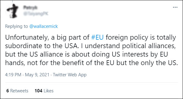 有的评论认为“很大一部分的欧盟外交政策就是彻底地服从美国,这非常地不幸。我理解政治盟友的重要性,但是做美国的盟友就意味着借欧盟的手,满足美国的利益,不是为了欧盟的利益,而只是为了美国”。