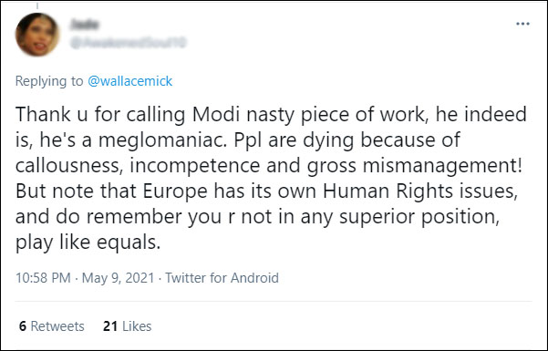 还有的评论赞同米克·华莱士对莫迪提出的批评,印度领导人的无能、麻木不仁和管理失调让很多无辜的民众死去。不过该网友也对米克的“欧洲人”的傲慢不满,他认为欧洲也有自己的人权问题,并没有比印度高人一等。