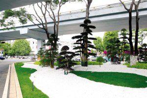 据西山区城市管理局相关负责人介绍,此次滇池路采莲桥下的绿化景观设计主题为“方寸之间见山水”,以“白卵石、绿洲、加拿利海枣以及造型树”为主要设计元素,借鉴山水画中“青绿、没骨、浅绛、淡彩”等手法模拟成自然山水景观。此外,还铺设1000余平方米雨花石,形成了步行道路。这样的设计有别于传统绿化设计,是立交桥下景观设计的一种创新尝试,也是西山区市政园林项目“精品化”的一个试点。