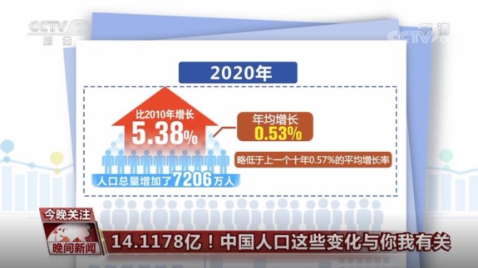 2020年,我国总人口达到14.1178亿人。过去十年,我国人口实现了从13亿人到14亿人的跨越,人口总量增加了7206万人,比2010年增长了5.38%,年均增长0.53%,略低于上一个十年0.57%的平均增长率。