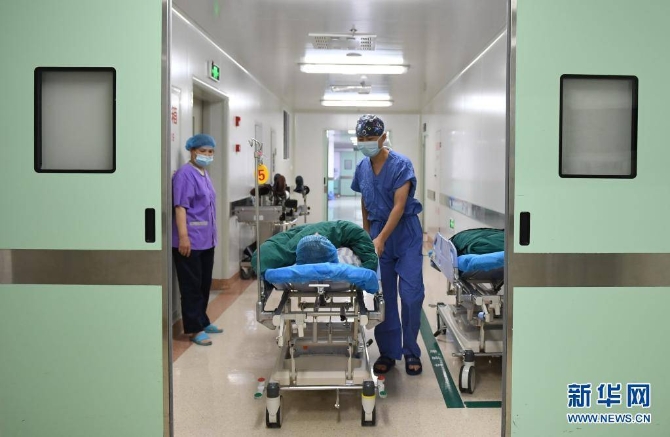 5月10日,福建中医药大学附属第二人民医院主管护师张志恩(右)推着患者进入手术室。新华社记者 林善传/摄