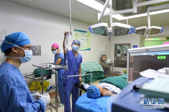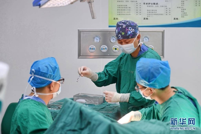 5月10日,福建中医药大学附属第二人民医院主管护师张志恩(中)在手术中给医生传递器械。新华社记者 林善传/摄