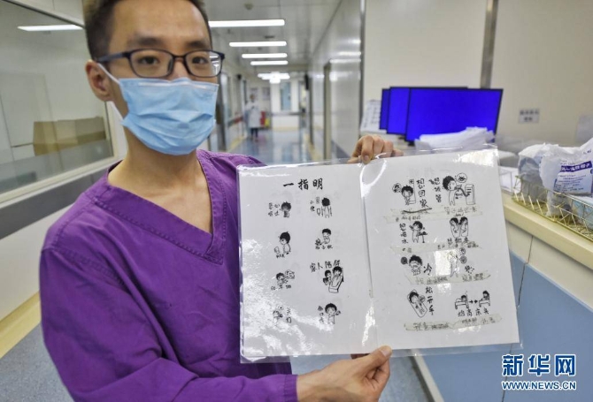 5月10日,刘鑫在四川省肿瘤医院ICU病房内展示为方便患者而绘制的“一指明”。新华社记者 刘坤/摄