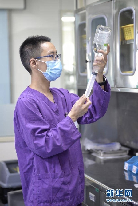 5月10日,刘鑫在四川省肿瘤医院ICU病房内准备配药。新华社记者 刘坤/摄