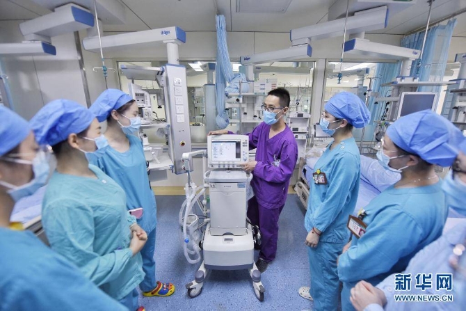 5月10日,刘鑫(中)在四川省肿瘤医院ICU病房内对新入职护士进行临床教学。新华社记者/刘坤 摄
