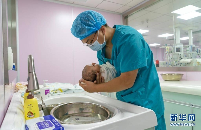 5月10日,李卓祥为一名新生患儿洗头。新华社记者陈欣波/摄