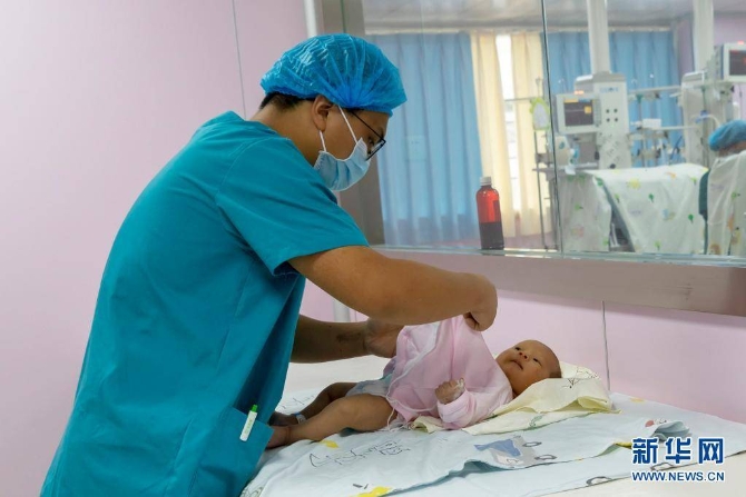 5月10日,李卓祥为洗完澡的新生患儿穿衣服。新华社记者陈欣波/摄