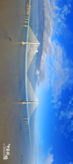 全长9273米,跨水面正桥长1615米,通航净空高度为32米,可以确保万吨级巨轮通过。