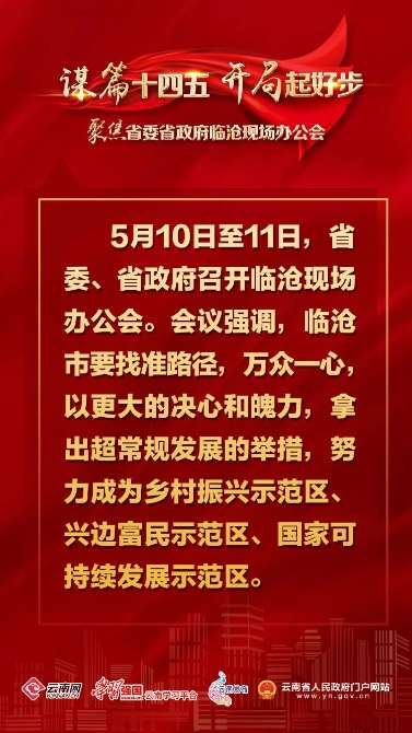 这次现场办公会,全面贯彻落实习近平新时代中国特色社会主义思想和习近平总书记考察云南重要讲话精神,对临沧提出打造“乡村振兴示范区、兴边富民示范区、国家可持续发展示范区”的定位和“十四五”时期经济发展年均增速10%以上,经济总量达1300亿元以上,到2035年经济总量达3500亿元以上的目标,严丝合缝符合临沧发展实际,为临沧指明了前进方向。我们将认真学习领会、深入贯彻落实好省委书记阮成发、省长王予波的讲话精神,知责于心、担责于身、履责于行,不折不扣贯彻落实省委、省政府的决策部署,真抓实干,奋发有为,奋力谱写全面建设社会主义现代化的临沧篇章,以优异成绩庆祝中国共产党成立100周年。