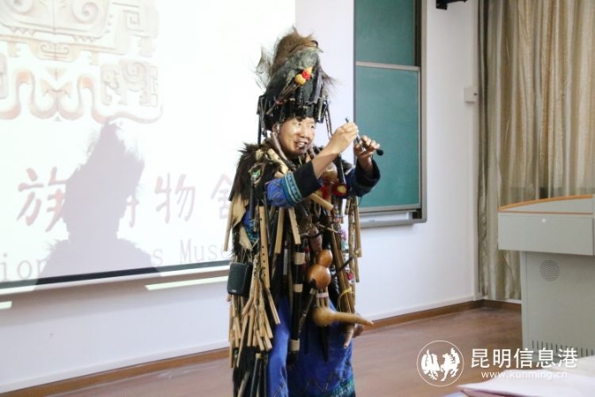 讲座主要以表演及手工体验的形式开展,现场在云南民族博物馆馆员王静介绍完展馆情况后,伴随着悠扬的乐器声,一位身上挂满乐器的云南民族民间歌舞乐传承人罗凤学登场,为现场100余名师生们先后表演了10多种乐器,吸引得大家掌声不断,纷纷举起手机录像。