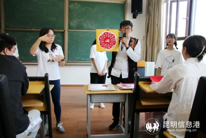 之后,在云南民族博物馆馆员吴松懿和昆明市非物质文化遗产(剪纸)传承人高庆的带领下,师生们又体验了香包制作和剪纸。制作香包的布料是由博物馆专门带来的民族刺绣,一块块绣片颜色艳丽、花纹独特,学生在动手体验非遗的同时,也收获了一件特别的纪念品。剪纸传承人高庆则结合建党100周年,教大家剪了一个带有党徽元素的图案。在各位老师的指导下,学生们拿起针线、剪刀,在手语老师的帮助下,兴趣浓厚的跟着学习,生怕遗漏了哪个步骤。