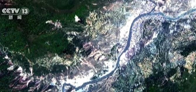 让我们通过卫星视角来看两张汶川的对比图。这是2008年地震过后,卫星拍摄到的汶川的画面。画面里,沿着山体显示白色的部分,就是地震引起的泥石流留下的痕迹。图中可见,满目疮痍、山河破碎。