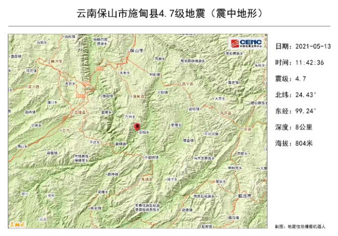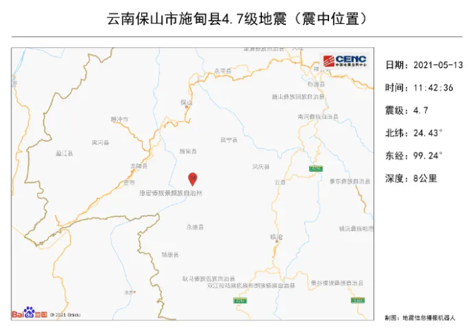 刚刚,据@中国地震台网 的消息,中国地震台网正式测定:05月13日11时42分在云南保山市施甸县(北纬24.43度,东经99.24度)发生4.7级地震,震源深度8千米。