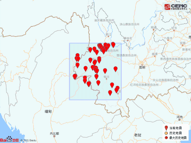 历史地震:根据中国地震台网速报目录,震中周边200公里内近5年来发生3级以上地震共101次,最大地震是2017年3月27日在云南大理州漾濞县发生的5.1级地震(距离本次震中172公里),按震级大小前50次历史地震分布如图。
