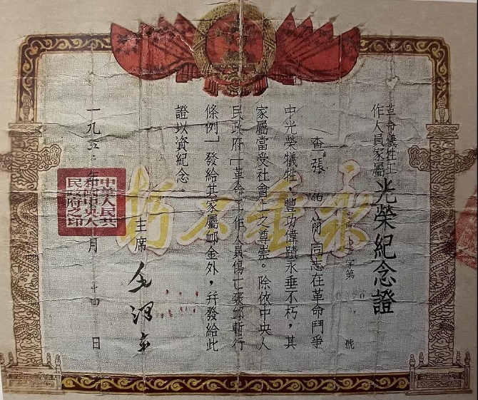 1952年,张伯简75岁的母亲接到了政府送来的由毛泽东同志签发的革命烈士家属光荣纪念证,激动得老泪纵横……