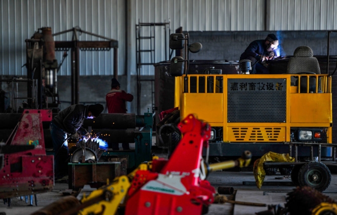 ↑2020年3月10日,工人在内蒙古嘉利节水灌溉有限公司厂房内加工零件。