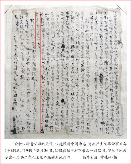 江姐本名江竹筠,1939年加入中国共产党。1948年6月14日,江竹筠被捕,被关押于重庆渣滓洞集中营。面对敌人的严刑拷打,始终坚贞不屈。“毒刑拷打,那是太小的考验。竹签子是竹子做的,共产党员的意志是钢铁。”她关心难友,参与领导狱中斗争,被亲切地称为“江姐”。1949年11月14日,在重庆解放前夕,江姐被国民党军统特务杀害,为共产主义理想献出29岁的生命。