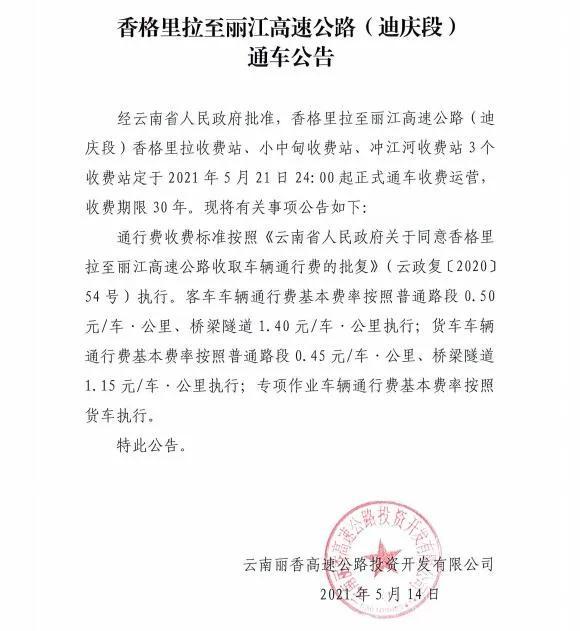 昆明信息港讯 记者上官艳君 5月14日,云南丽香高速公路投资开发有限公司发布通车公告,香格里拉至丽江高速公路(迪庆段)香格里拉收费站、小中甸收费站、冲江河收费站3个收费站将于5月21日24时起正式通车收费运营。