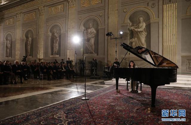 2020年2月13日,在意大利罗马总统府奎里纳莱宫,旅意华人钢琴家居觐在音乐会现场演奏。当日,由意大利总统马塔雷拉提议,在2020年中意文化旅游年计划外加演的一场钢琴独奏音乐会在意大利总统府举行,向抗击新冠肺炎疫情的中国人民传达友谊和支持。新华社记者 程婷婷 摄