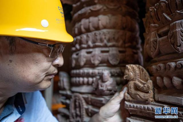 2019年10月10日,在尼泊尔加德满都杜巴广场,中国派出的文物修复队技术主管周建国在九层神庙修复现场查看一个修复好的文物。新华社记者 王婧嫱 摄