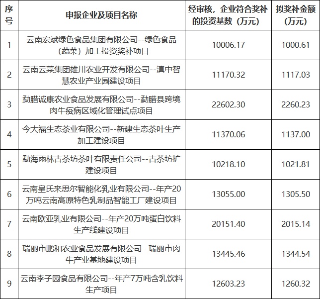 近日,云南省工业和信息化厅、云南省财政厅发布《关于2020年绿色食品加工业龙头企业投资奖补政策拟支持项目名单的公示》,根据相关文件精神及相关政策要求,经省工业和信息化厅、省财政厅审核,现将名单予以公示。公示期自公示之日(5月14日)起7个工作日。