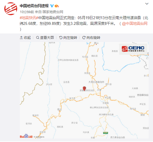 5月19日21时13分 大理州漾濞县再发3.2级地震