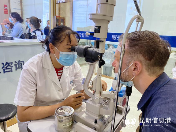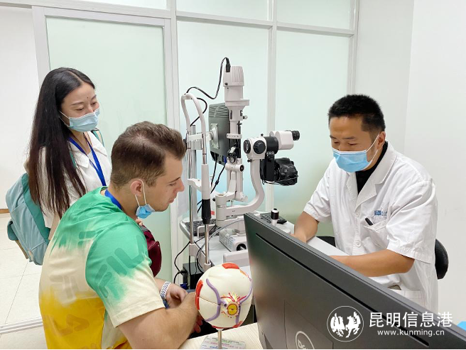 “接下来大家可以体验干眼的螨虫检查……”外教们参观了昆明艾维眼科医院特色干眼门诊,昆明艾维眼科医院角膜病及眼表专科副主任张玉英医生为大家介绍了什么是干眼症,干眼诊疗设备分别有什么用途,怎么治疗干眼症等。