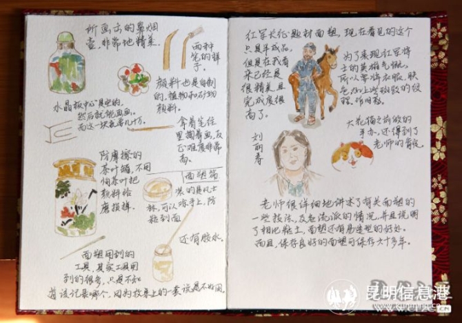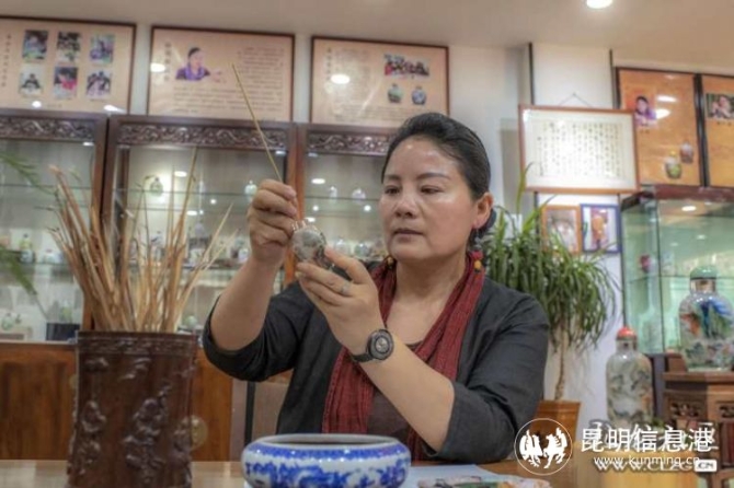 跟随打卡活动的脚步,当天下午网友们来到官渡街道体验非遗文化的魅力。“滇派内画是内画四大流派后的一个新秀,呈现了云南的民族特色和山水之美,方寸之间尽显乾坤。”随着滇派内画非遗传承人孙鸿雁的介绍,网友们和她一起走进了滇派内画的世界。现场,孙鸿雁还执笔作画,细笔在水晶瓶内勾勒出云南山水美景,精美的作品收获现场赞叹连连。而滇派面塑非遗传承人刘丽春的面塑作品同样也吸引了网友们的镜头,栩栩如生的面塑作品展现了云南风土人情也传递了非遗手工艺的魅力。