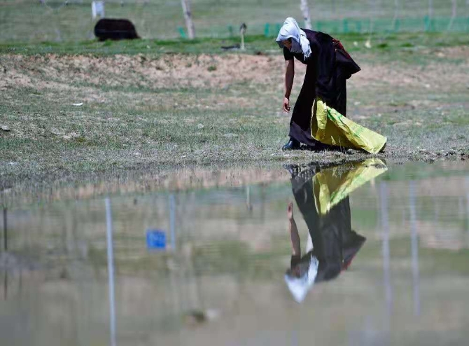 2020年8月19日,在青海省果洛藏族自治州玛多县玛查理镇噶丹村,生态管护员才让卓玛在村子周边的草原上捡垃圾。