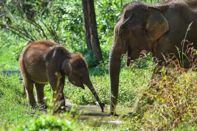 2019年11月13日,在云南亚洲象种源繁育及救助中心附近,两只亚洲象参加野化训练。