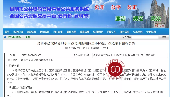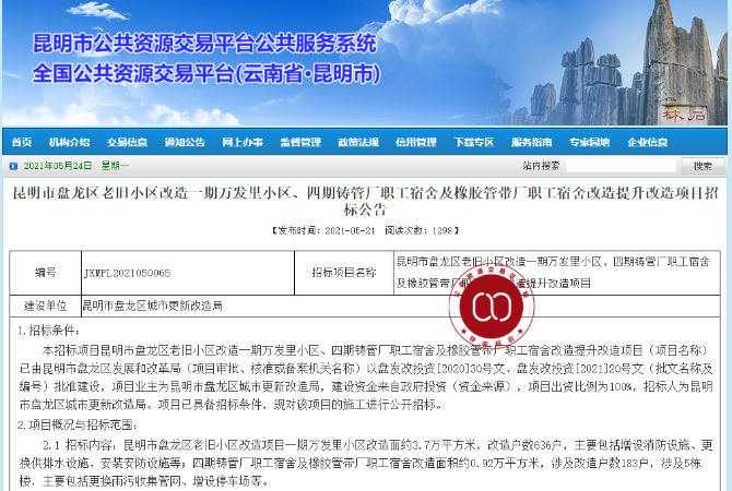 5月21日,昆明市公共资源交易平台网站发布《昆明市盘龙区老旧小区改造一期万发里小区、四期铸管厂职工宿舍及橡胶管带厂职工宿舍改造提升改造项目招标公告》。