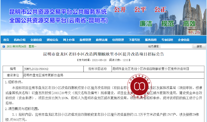 近日,昆明市公共资源交易平台网站发布了,颐园里、颐欣里等几个小区的提升改造项目招标公告。