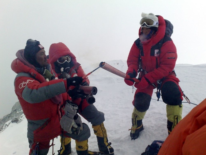 ↑2020年珠峰高程测量队在珠峰峰顶树立觇标