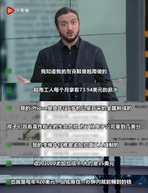 随后坎普话锋一转,“我知道我的耐克鞋是越南工厂做的,越南工人每个月拿着73.94美元薪水,我的苹果手机是由年仅6岁的儿童开采的金属制成的,李维斯牛仔裤是孟加拉工人缝制的。”坎普说道,“这都没什么,没人会在意!只有身处中国新疆的劳工才重要。”而对于为什么是新疆劳工,坎普“支支吾吾”半天后“终于”说道,“因为我们需要阻止中国制造!s**t”。