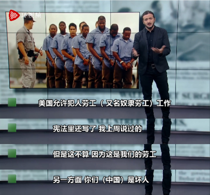 “美国允许犯人劳工,又名奴隶劳工(工作),宪法里还写了这事,我上周说过的。但是这不算,因为这是我们的劳工,另一方面,你们(中国)是坏人。”