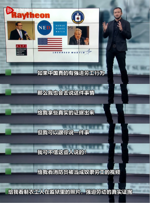 坎普最后说道,如果中国真有强迫劳工,那自己也会去说这事。“但我可以跟你说一件事,我可不信这些人(传播谣言的人)说的!”坎普“激动”道:“给我拿些真实的证据出来!给我看消防员被当成奴隶劳工的视频!给我看制衣工人在监狱里的照片!强迫劳动的真实证据!”坎普道歉说“对不起,这些照片说的都是美国......”