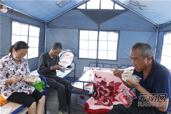抢在下雨前搭好帐篷23日上午,记者来到秀岭村委会秀岭村民小组,赵春丽、赵春斌两姐弟胸佩党徽,正带领集中安置点的村民们用帆布搭建临时厨房。“一下雨,露天厨房就不方便使用。今早我专门回家,从倒塌的土墙下翻出了这两卷帆布。”赵春斌平日在巍山打工,22日一早专程赶回秀岭村,帮助村民抗震救灾。天气预报说24日有雨,他们要赶在下雨前搭建好安置点22户村民共同使用的临时厨房。24日中午,记者来到漾濞县人和广场安置点,居民施继权一家正在帐篷里吃盒饭。“早点、午饭、晩饭都有提供,有时自己去拿,有时志愿者送来,除了中午天气有点热,生活在这里挺安适的。”人和广场是漾濞县城中最大的一个居民集中安置点,共有161顶帐篷,22日凌晨4点开始对民众开放,当天就住满。安置点每天下午6:00以后统计清理,将空置的帐篷优先安排给老人和儿童居住。“周边的老百姓都是安置对象,帐篷里有折叠床、棉被,定期进行方便面、面包、火腿肠、矿泉水等物资发放。”在人和广场安置点为群众提供服务保障的漾濞县委组织部副部长范曙程介绍,安置点专门设立了党员服务站,成立了仓括工作人员和安置居民的40人党员先锋队,为安置点群众提供服务。