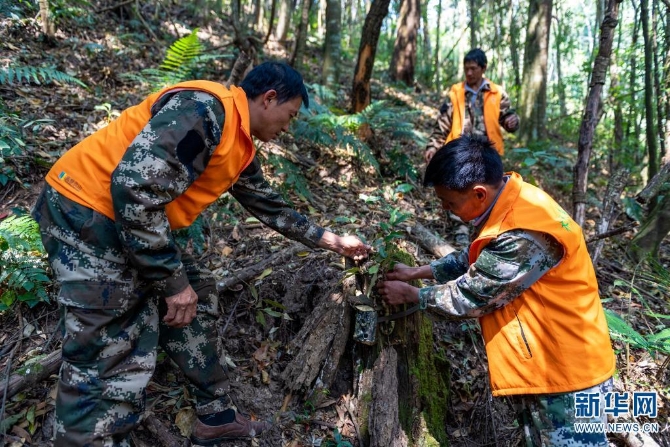 护林员杨有山(右一)和同事在布设红外相机(3月15日摄)。新华社记者 陈欣波 摄
