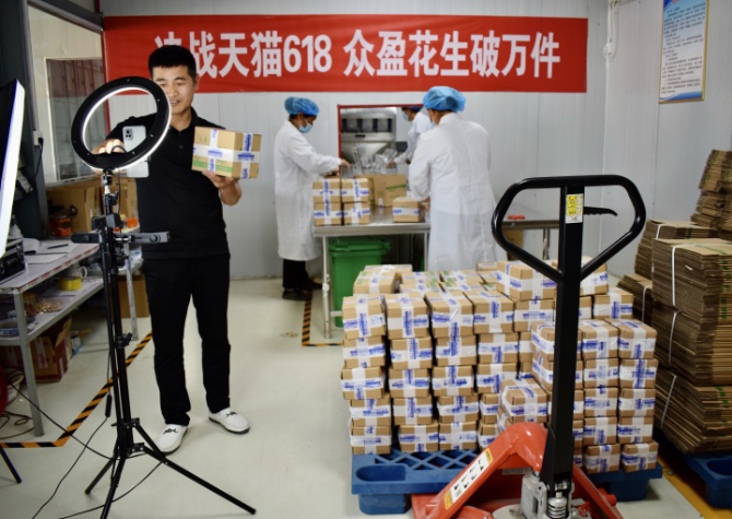 (图说:确山县农民主播白晶在车间淘宝直播带货花生米)