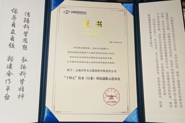 5月22至24日,第十八届中国科学家论坛在北京举行。云南天外天天然饮料有限责任公司荣获“2021中国科技发展典范企业”称号,董事长王忠获评“十四五中国高质量发展创新人物”,云南天外天天然饮料有限责任公司被评为“中国健康饮水科技创新示范单位”,石林天外天PH9.3碱性天然矿泉水作为中国科学家论坛指定用水。