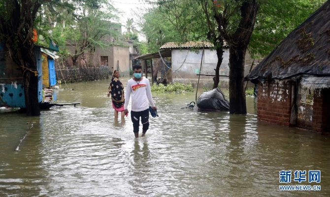 5月26日,在印度巴拉索尔一个遭水淹的村庄,村民们涉水出行。新华社发