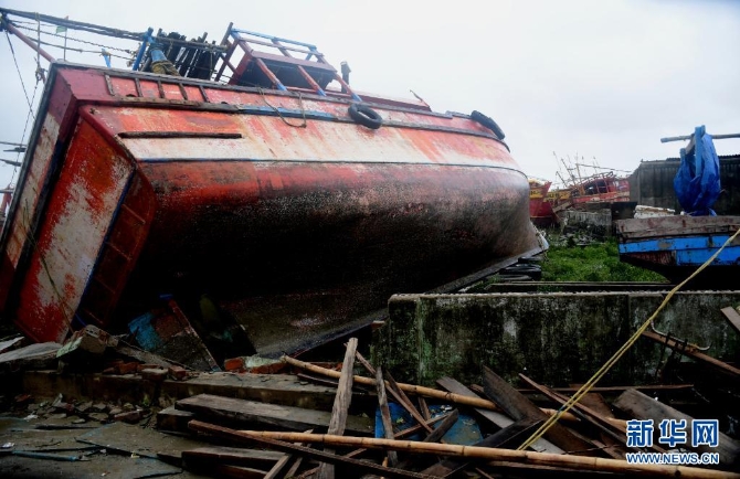 这是5月26日在印度巴拉索尔拍摄的被风刮倒的渔船。新华社发