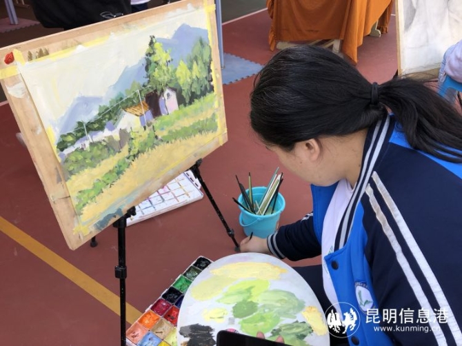 在美术展区,同学们进行现场创作。记者上官艳君 摄
