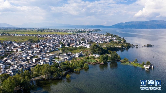 这是2020年9月3日拍摄的云南省大理市古生村村貌与洱海风光(无人机照片)。新华社记者 胡超 摄