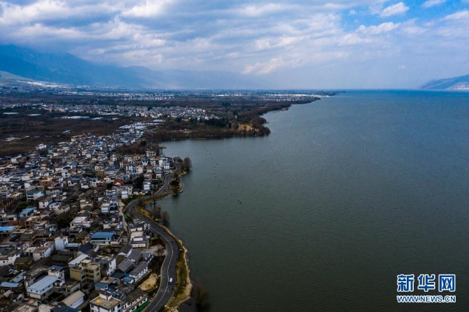 大理市环洱海流域湖滨缓冲带生态廊道逐步完善(1月11日摄,无人机照片)。新华社记者 江文耀 摄