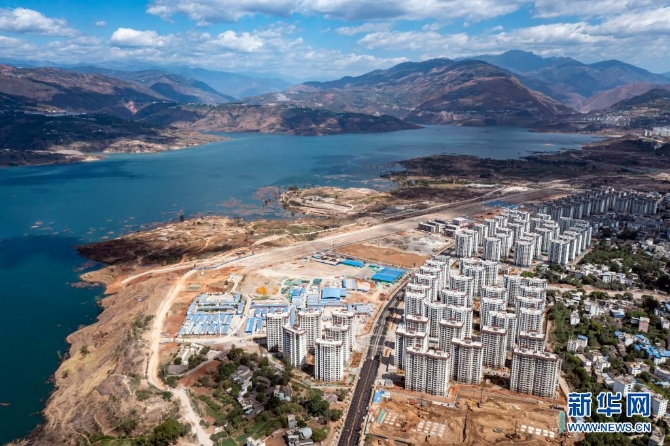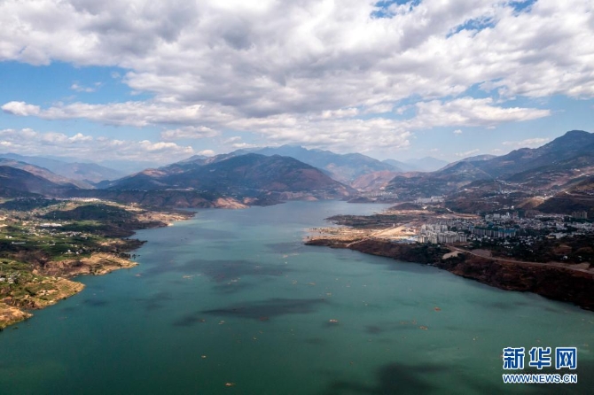 正在蓄水的白鹤滩水电站库区以及建设中的移民搬迁点(5月15日摄,无人机照片)。新华社记者 江文耀 摄
